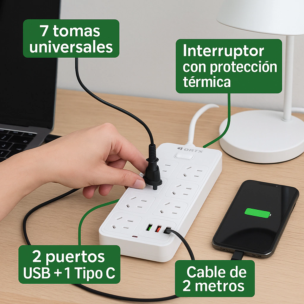 Zapatilla electrica 7 tomas con puertos usb y tipo-c / OR-EC72M